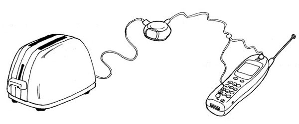 Beam2Me connecting a household appliance to a phone via cable and accoustic coupling.