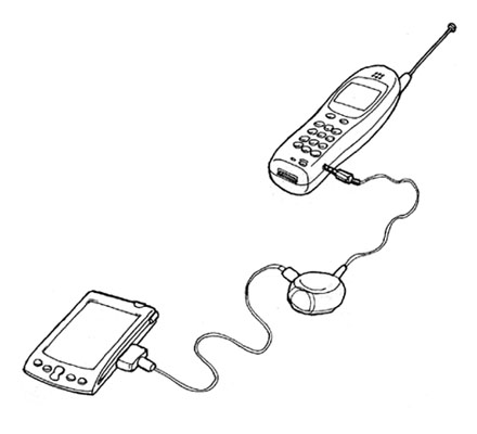 Beam2Me connecting a PDA to a phone via cable and audio jack.